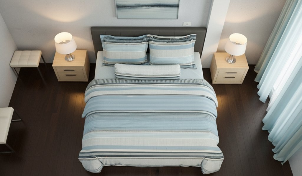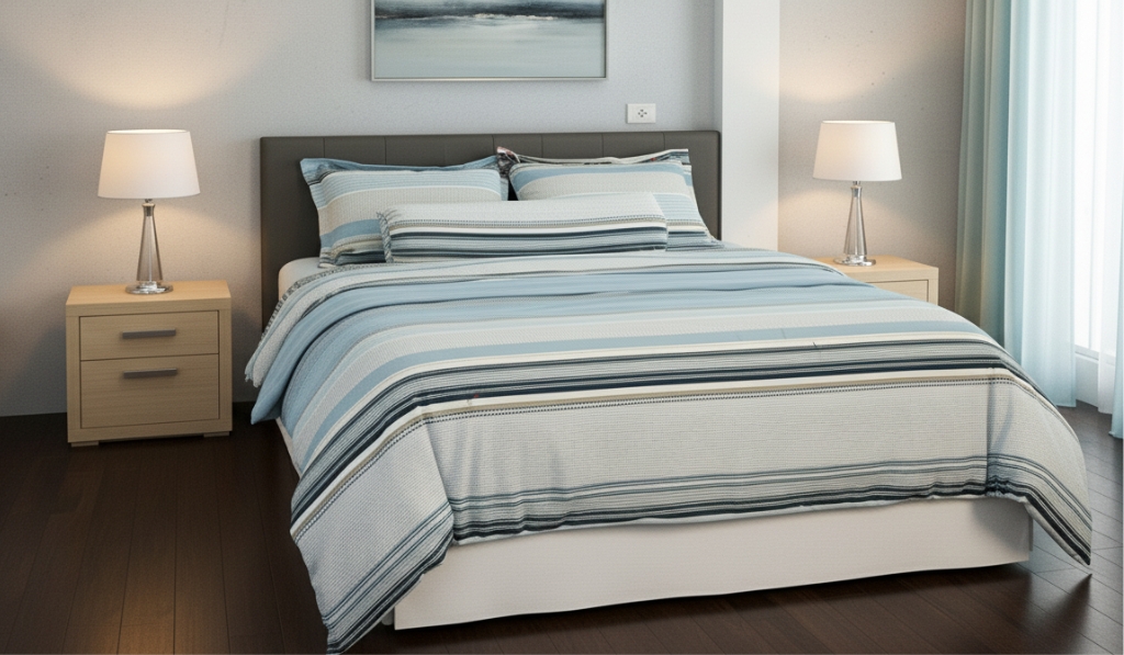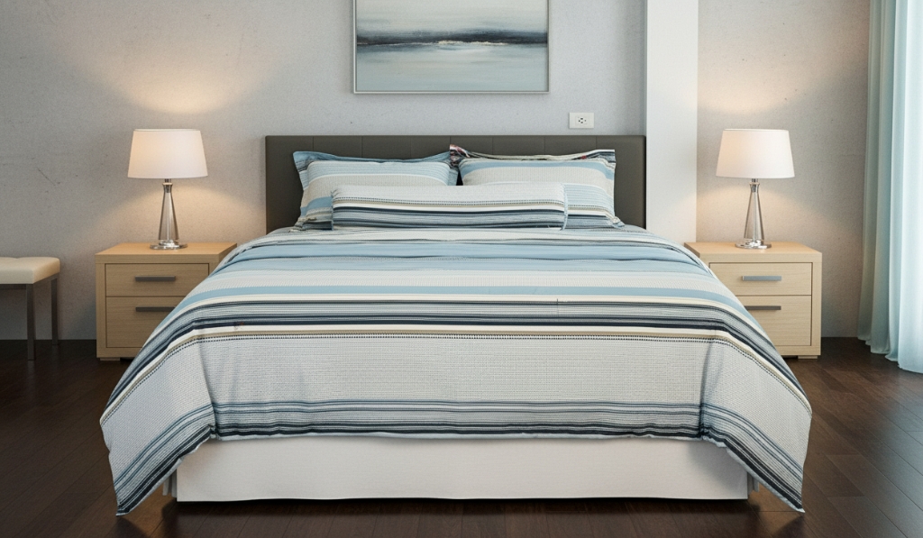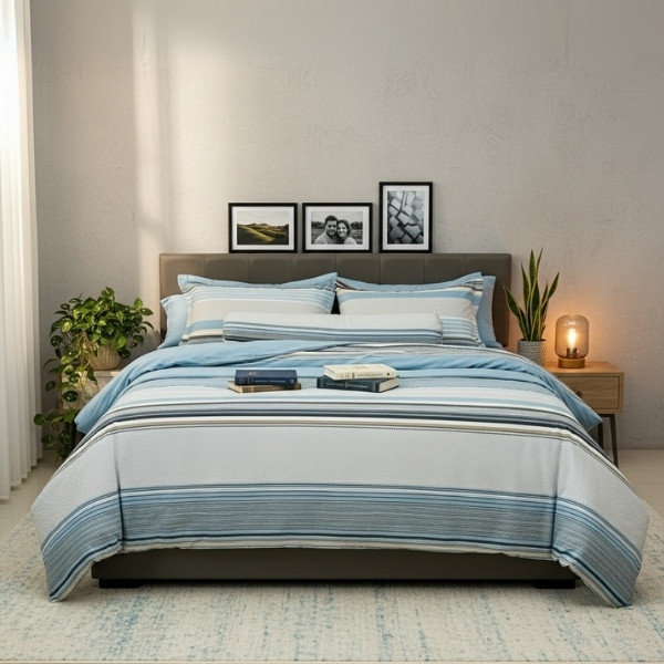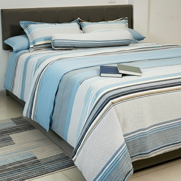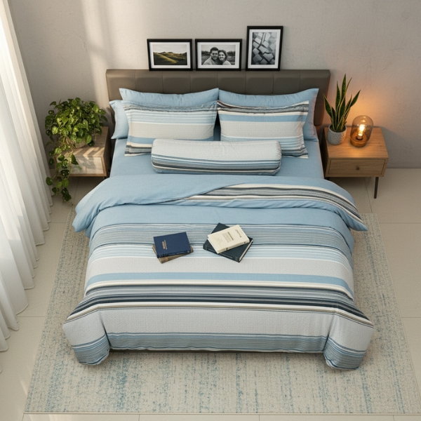 Với thiết kế kẻ sọc thanh lịch, kết hợp gam màu xanh dương mát mắt, sản phẩm không chỉ mang lại cảm giác thư thái mà còn tạo điểm nhấn hiện đại, sạch sẽ và sang trọng cho phòng ngủ của bạn.