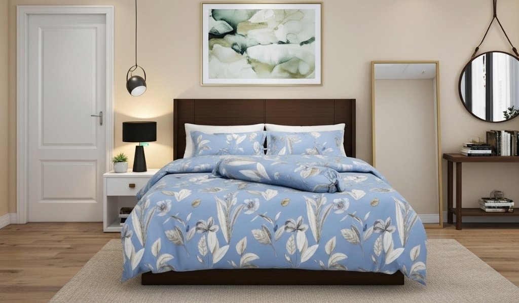 Họa tiết lá dương liễu mềm mại được in tinh tế trên nền xanh nhạt dịu mắt, mang lại cảm giác yên bình và thư giãn – lý tưởng để phục hồi năng lượng sau một ngày dài.