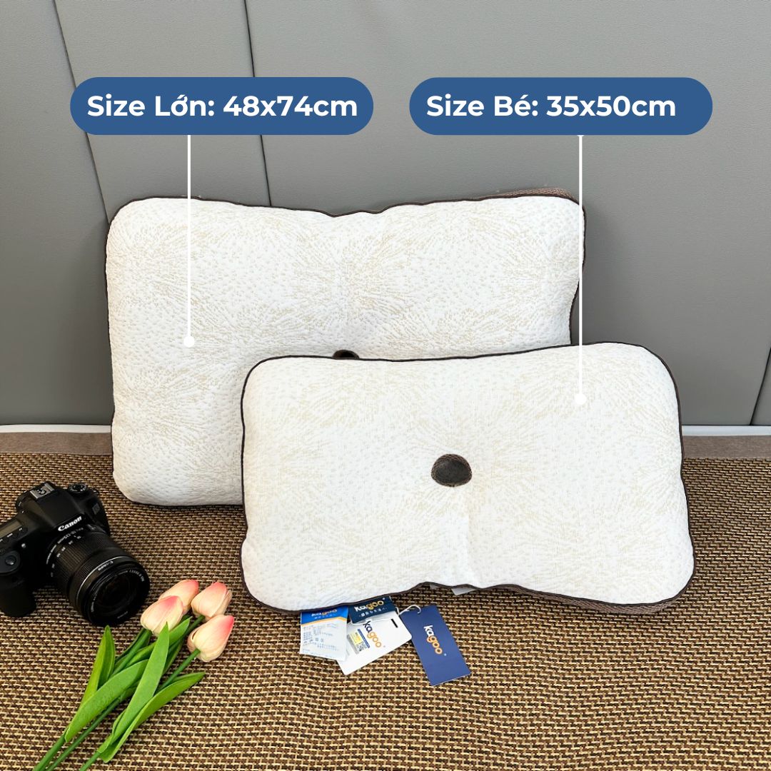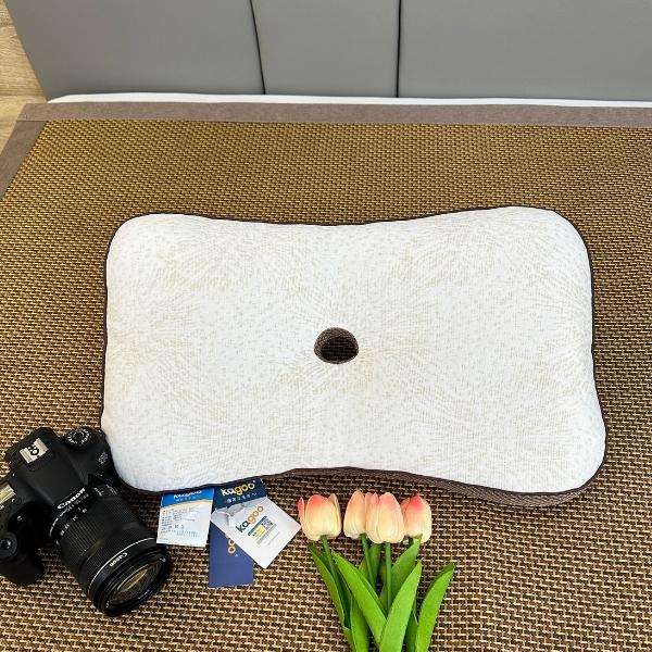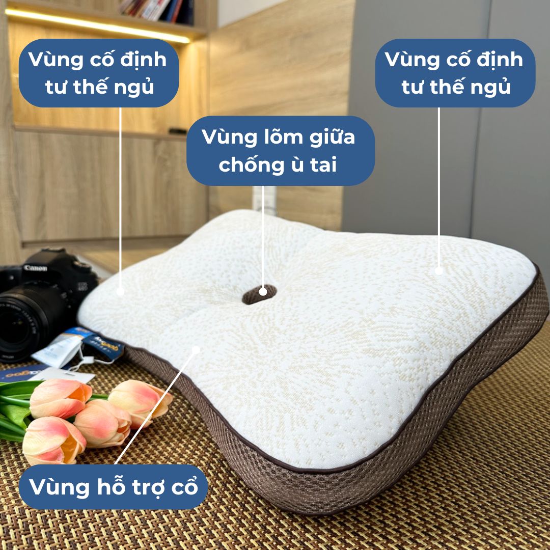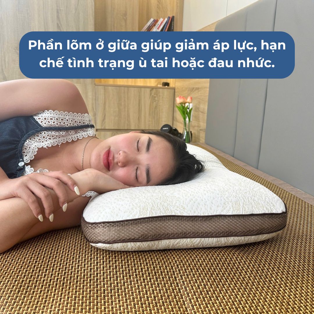 - Gối có phần lõm ở giữa, tạo khoảng trống cho tai khi nằm nghiêng – giúp giảm áp lực, hạn chế tình trạng ù tai hoặc đau nhức.