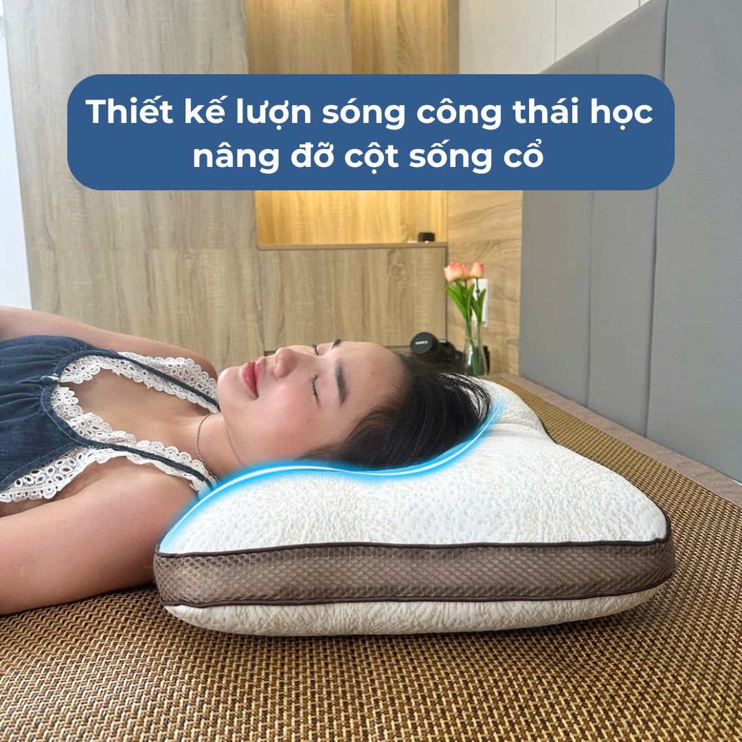 - Form gối cong nhẹ theo đường cong đầu và cổ, hỗ trợ giữ thẳng cột sống cổ khi ngủ.