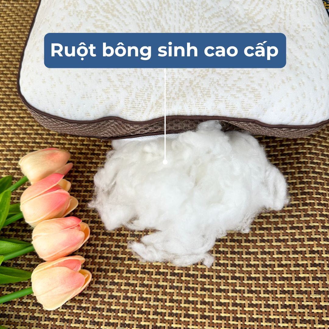 - Ruột gối bằng bông sinh học cao cấp, đàn hồi vừa phải, không xẹp lún, không tạo tiếng động khi trở mình.